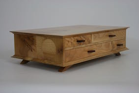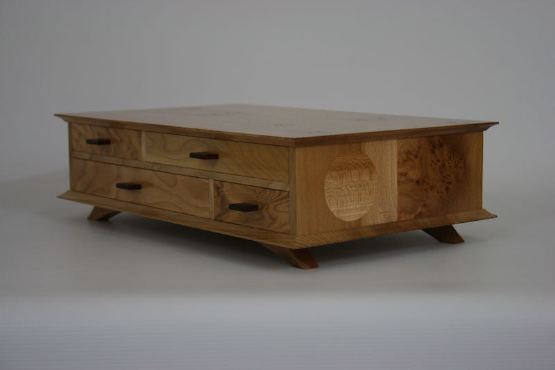 A desktop keepsake box in French polished Elm with contrasting Ash drawer fronts and Cedar drawer liners Subtle circular inlays in the sides add a little fun 420mm wide, 80mm high, 260 deep Click on the photos for a larger image